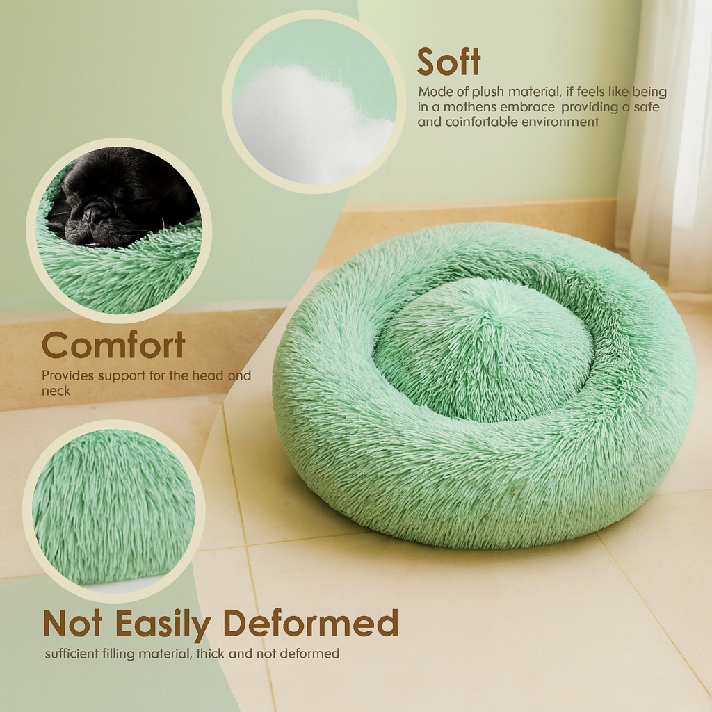 This calming donut bed features a round shape with raised edges that support your pet’s head and neck, creating a sense of security and helping reduce anxiety. Perfect for cats and small dogs who love to curl up and feel protected.