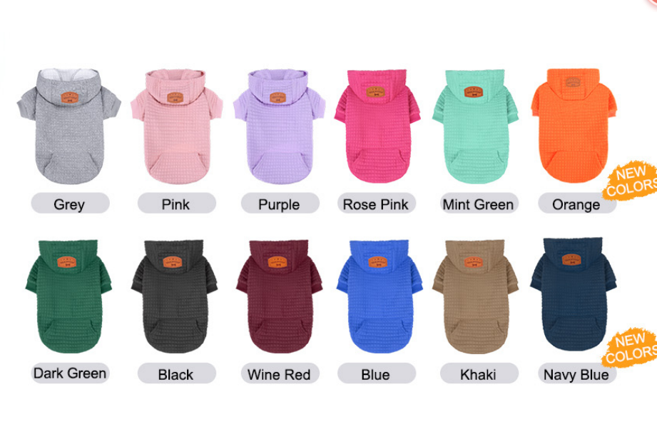 Soft and breathable dog hoodie made from 95% polyester and 5% spandex with waffle-textured cotton. Designed for small, medium, and large dogs, this warm pet sweatshirt features a drawstring hood, belly cut, leash hole, and mini pocket for comfort and convenience. Machine washable, stylish, and perfect for cold-weather walks, daily wear, and festive outings.